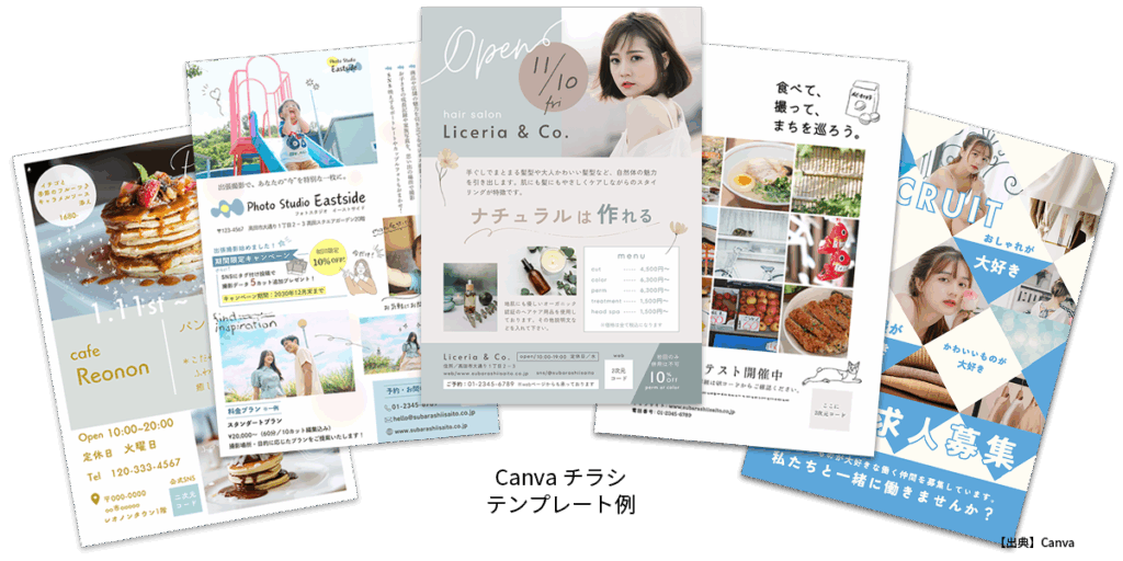 「Canva」という無料で使えるオンラインデザインツールを使うと、「こんな素敵なチラシがつくれるの!?」と驚くほど、簡単にチラシデザインが可能です!